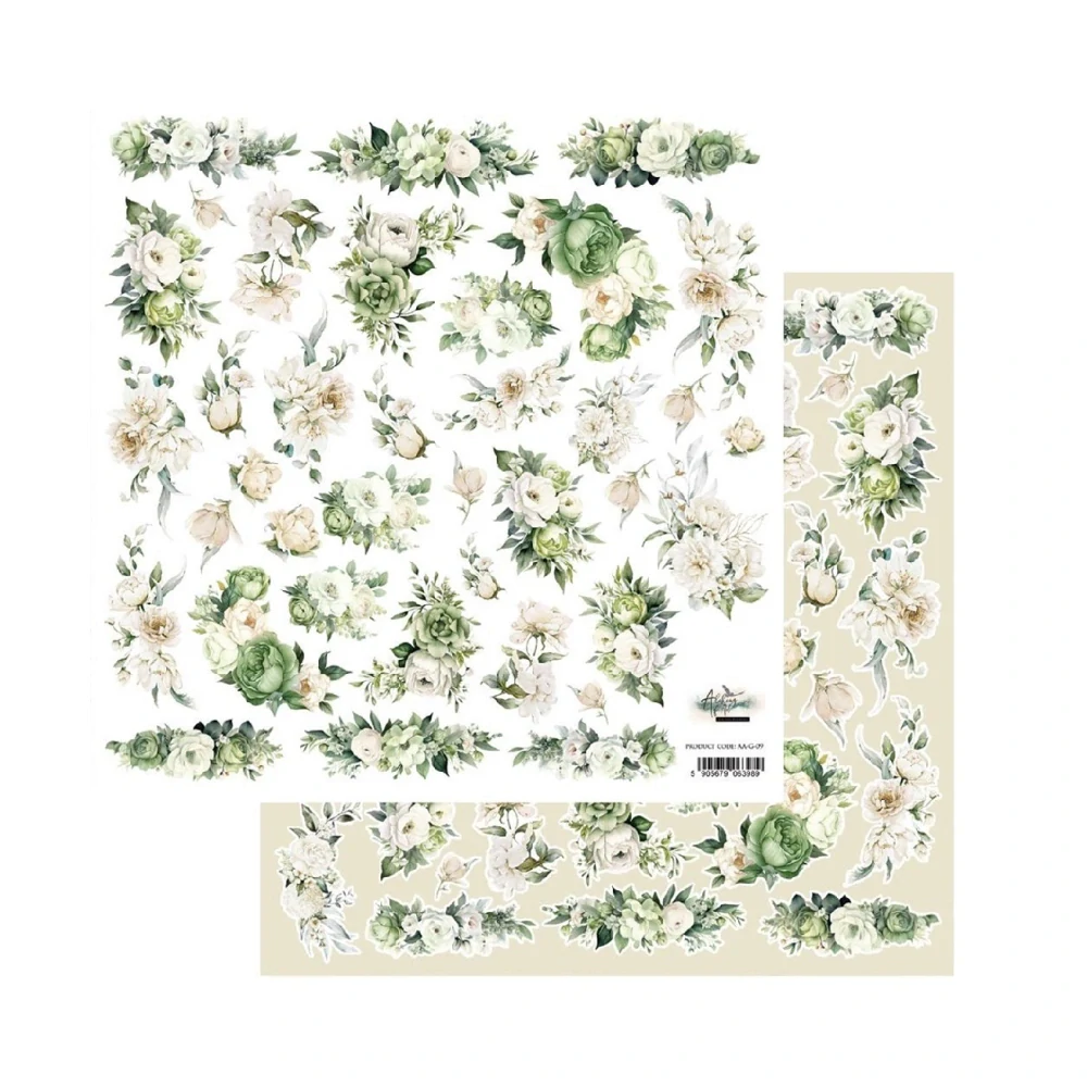 Obojstranne potlačený scrapbook papier so zrkadlovou tlačou – rovnaké motívy sú natlačené z oboch strán papiera, pričom jedna strana obsahuje naznačené línie pre jednoduchšie vystrihovanie. Formát papiera je 12×12 inch / 30,5×30,5 cm.