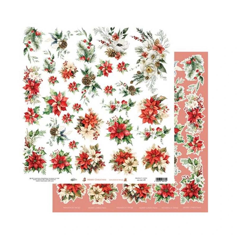 Obojstranne potlačený scrapbook papier so zrkadlovou tlačou – rovnaké motívy sú natlačené z oboch strán papiera, pričom jedna strana obsahuje naznačené línie pre jednoduchšie vystrihovanie. Formát papiera je 12×12 inch / 30,5×30,5 cm.